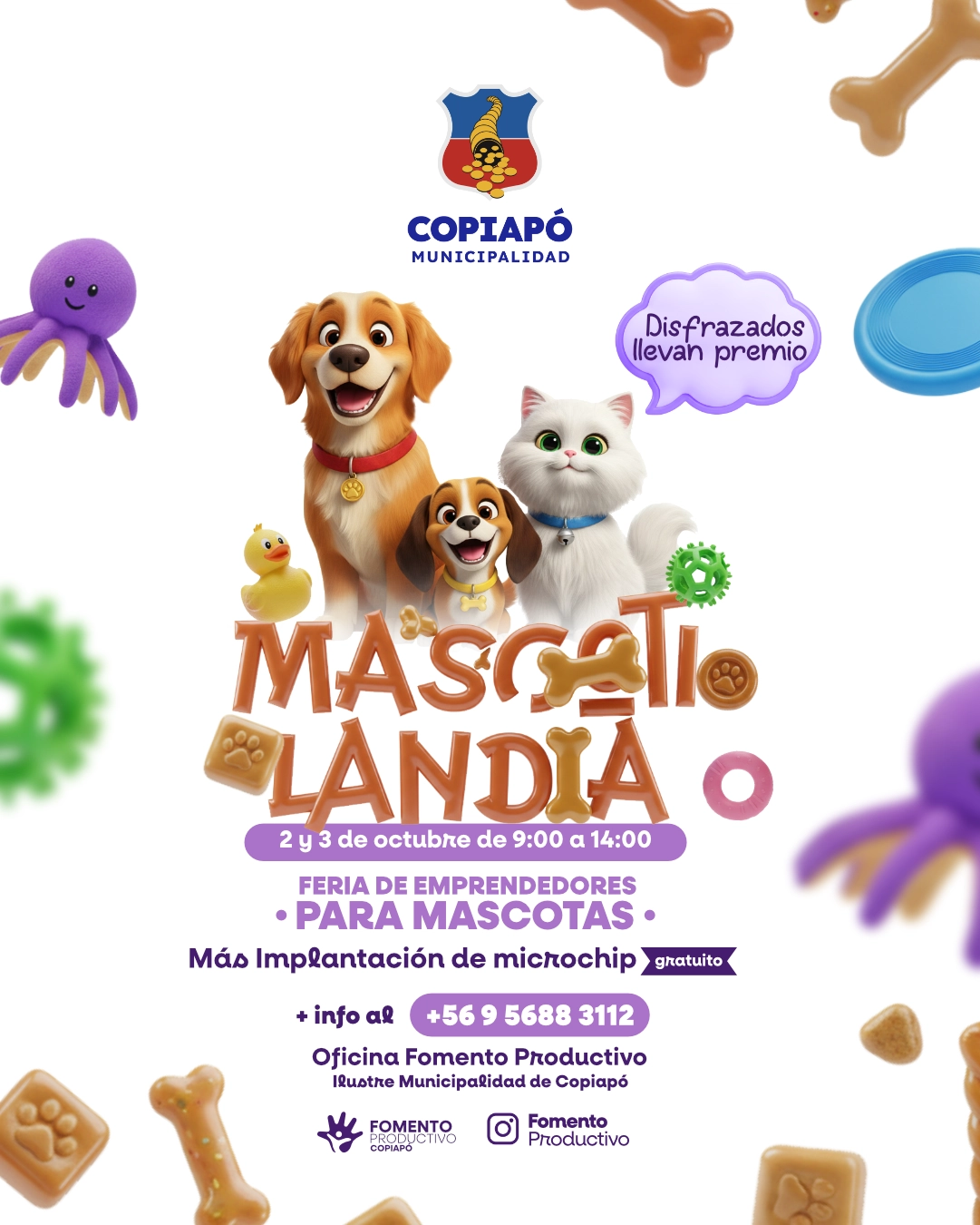 La Municipalidad de Copiapó, a través de su Oficina de Fomento Productivo, invita a la comunidad a participar de la feria de emprendedores “Mascotilandia”, que se realizará el jueves 2 y viernes 3 de octubre, de 09:00 a 14:00 horas, en el frontis municipal.